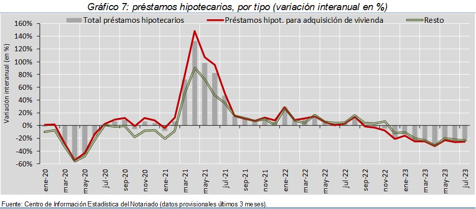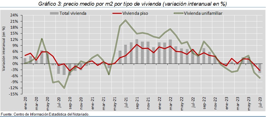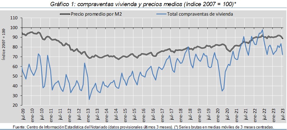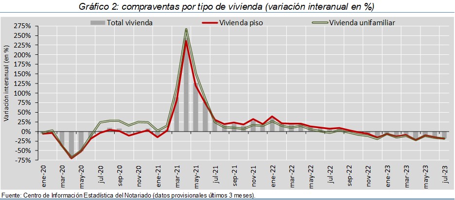 La compraventa de viviendas cae un 18,4% interanual en jul-23