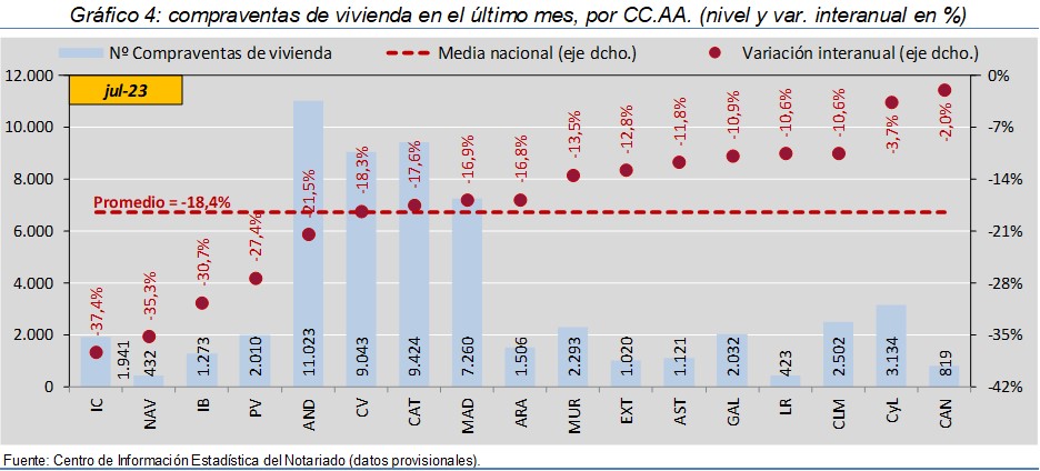 - La compraventa de viviendas cayó en la totalidad de CC.AA., destacando las caídas en Canarias (-37,4%), Navarra (-35,3%) y Baleares (-30,7%)