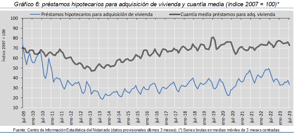 Continúan cayendo la compraventa de viviendas y sus precios. De igual forma, la concesión de préstamos hipotecarios registró un retroceso mientras que la constitución de sociedades avanza.