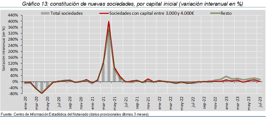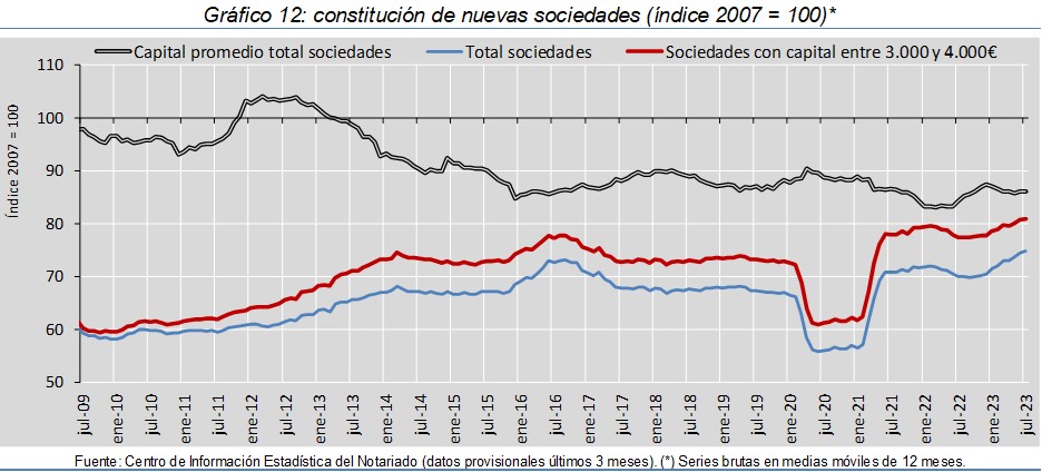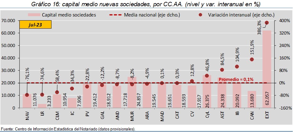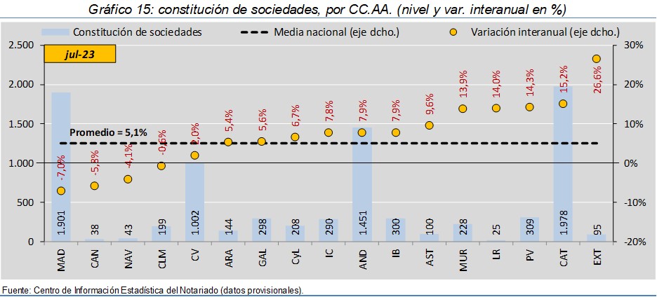 - La constitución de nuevas sociedades crece un 5,1%. Destacan los aumentos en Extremadura (26,6%), Cataluña (15,2%) y País Vasco (14,3%) y los retrocesos en Madrid (-7,0%), Cantabria (-5,8%) y Navarra (-4,1%)