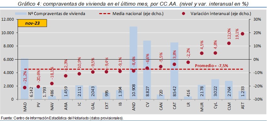 - La compraventa de viviendas disminuye en trece CC.AA. y crece en las cuatro restantes. Destacan las caídas en Madrid (-21,2%), el País Vasco (-20,6%) y Navarra (-18,1%) y las alzas en Asturias (19,1%), Castilla-La Mancha (12,0%) y Castilla y León (4,8%)