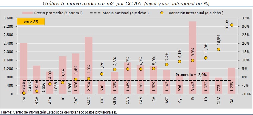 - En España el precio del m² baja de media un 2,0% interanual, ralentizándose por tercer mes consecutivo. Destacan las caídas en el País Vasco (-9,5%) y Navarra (-8,4%) y los ascensos en Galicia (30,9%) y Castilla-La Mancha (16,5%)