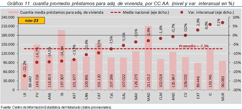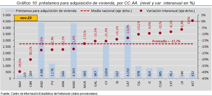 - Los préstamos para adquisición de vivienda disminuyen un 17,7%. Caen en 16 autonomías, destacando Navarra (-39,5%), Cantabria (-30,1%) y Andalucía (-22,5%) y sólo crecen en Asturias (0,6%)