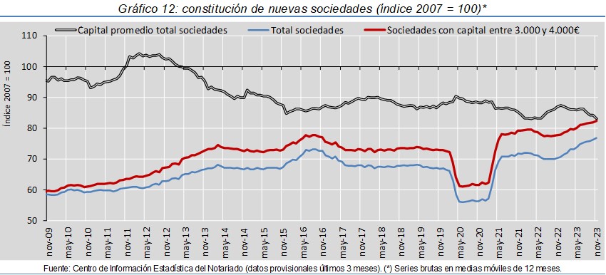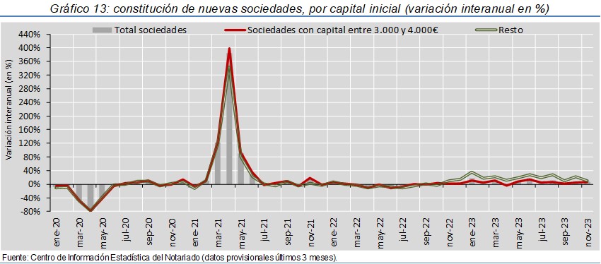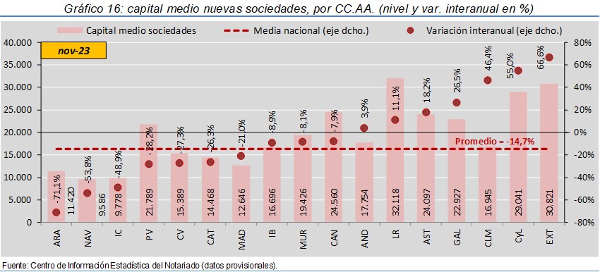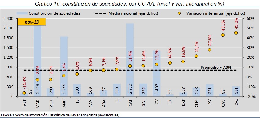 - La constitución de nuevas sociedades crece de media un 7,0% interanual. Destacan los aumentos en Castilla y León (45,2%), Cantabria (43,1%) y el País Vasco (27,8%) y los retrocesos en Asturias (-16,4%), Madrid (-2,9%) y Murcia (-2,7%)