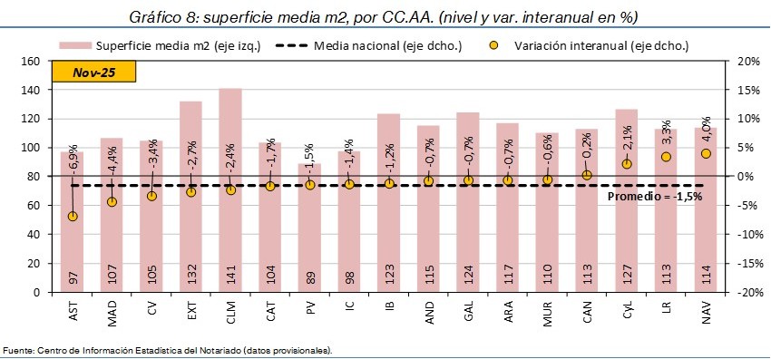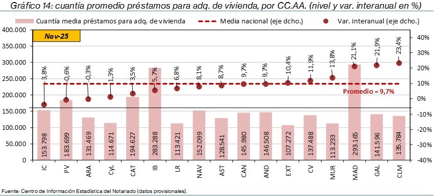 - El precio del m² sube un 6,3% interanual en España. Destacan los ascensos en Castilla-La Mancha (22,3%), Asturias (19,5%) y Región de Murcia (19,0%) así como la caída en Castilla y León (1,0%).Los préstamos para adquisición de vivienda aumentan un 6,5% interanual en España. Crecen en catorce comunidades autónomas, destacando Navarra (17,4%), La Rioja (17,3%) y Castilla-La Mancha (15,5%), y caen en las tres restantes.