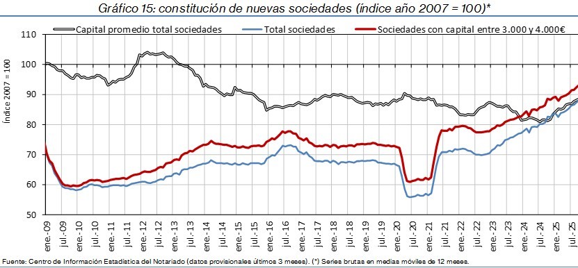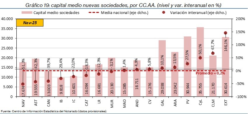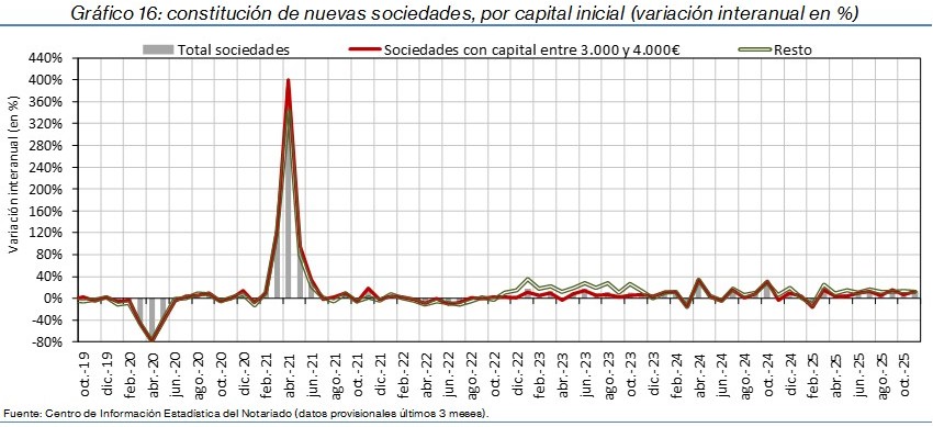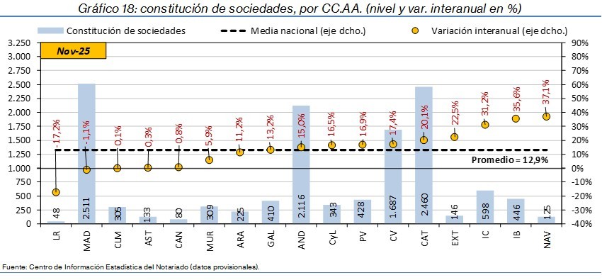 - La constitución de nuevas sociedades crece un 13,0% interanual en España. Destacan los aumentos en Navarra (37,1%) e Islas Baleares (35,6%) y los retrocesos en La Rioja (17,2%) y Comunidad de Madrid (1,1%).