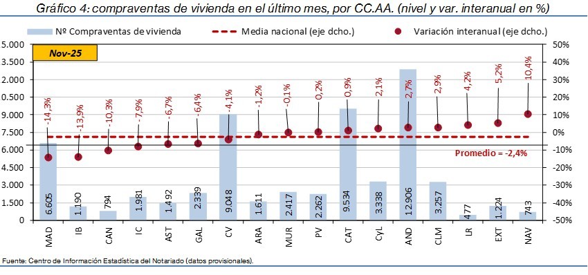 - La compraventa de viviendas decrece en nueve comunidades autónomas y crece en las ocho restantes. Destacan las caídas en Comunidad de Madrid (14,3%), Islas Baleares (13,9%) y Cantabria (10,3%) y las alzas en Navarra (10,4%) y Extremadura (5,2%).