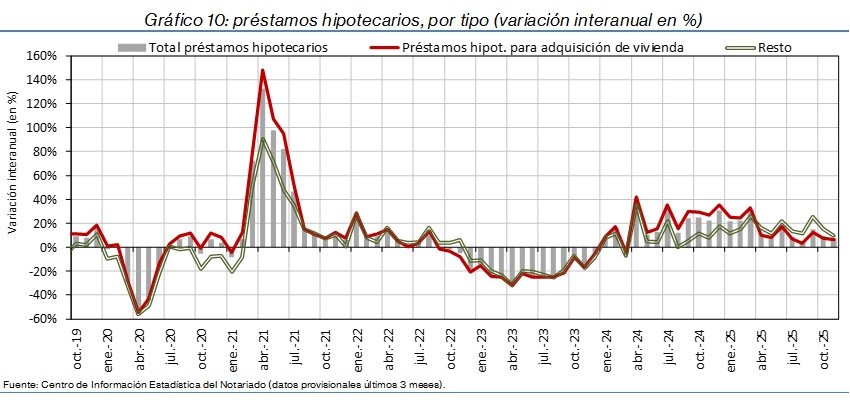 El mercado inmobiliario y financiero presenta una evolución desigual entre comunidades autónomas, con descensos de la compraventa de viviendas en nueve regiones y crecimiento en ocho autonomías. En este contexto, el precio del metro cuadrado mantiene un fuerte dinamismo, con un aumento interanual del 6,3% en España, mientras que los préstamos para la adquisición de vivienda avanzan un 6,5% y la creación de nuevas sociedades se incrementa en un 13,0%.