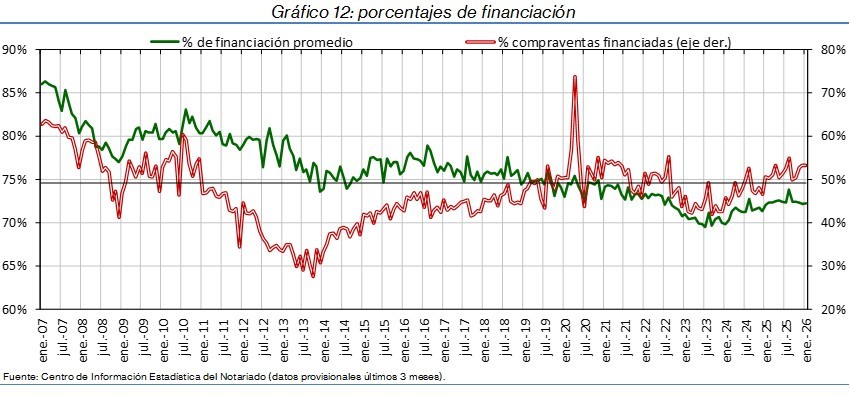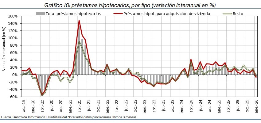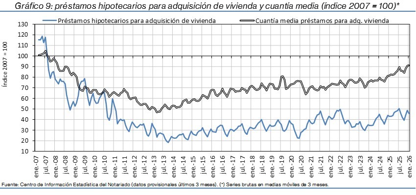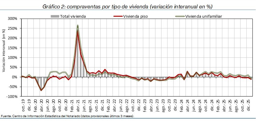 La compraventa de viviendas muestra un retroceso generalizado en España, en un contexto de evolución desigual del mercado inmobiliario y financiero. Frente a esta caída de la actividad, el precio del metro cuadrado mantiene un fuerte dinamismo, con un incremento interanual del 9,0%, mientras que los préstamos para la adquisición de vivienda se reducen un 6,8%, la creación de nuevas sociedades apenas varía, con un ligero aumento del 0,2%.