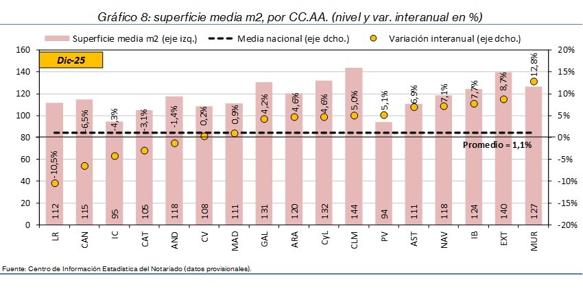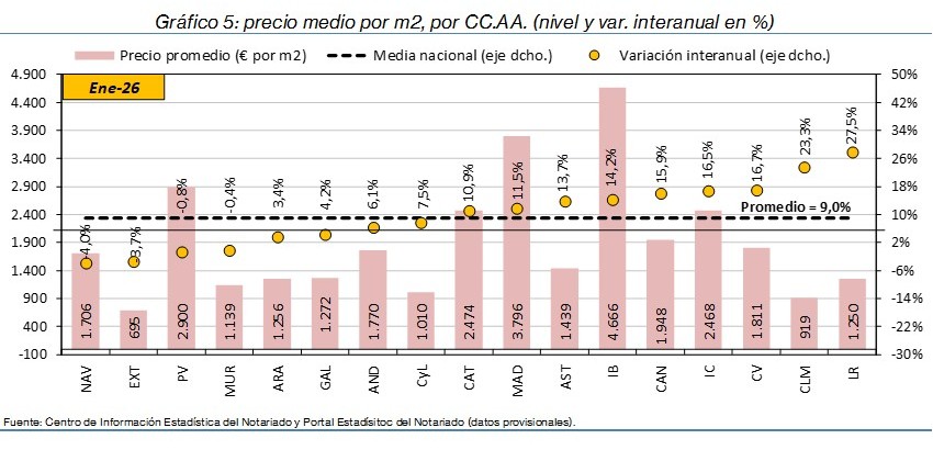 - El precio del m² subió un 9,0% interanual en España, con alzas en trece autonomías. Destacaron los ascensos en La Rioja (27,5%) y Castilla-La Mancha (23,3%), así como las caídas en Navarra (-4,0%) y Extremadura (-3,7%).