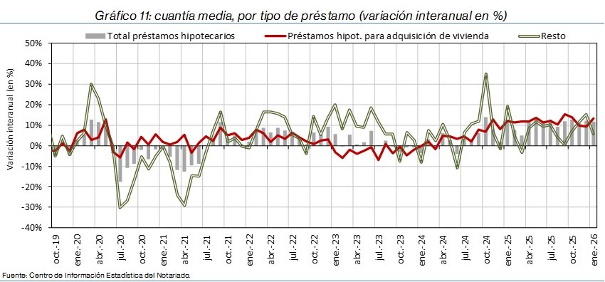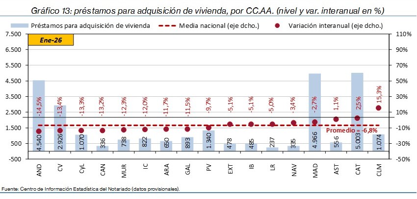 - Los préstamos para adquisición de vivienda disminuyeron un 6,8% interanual en España, tras 21 meses al alza. Se redujeron en catorce comunidades autónomas, destacando en Andalucía (-14,5%), Comunidad Valenciana (-13,4%), Castilla y León (-13,3%) y Cantabria (-13,2%) y crecieron en las tres autonomías restantes: Castilla-La Mancha (15,3%), Cataluña (2,5%) y Asturias (1,1%).