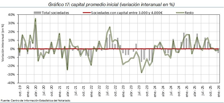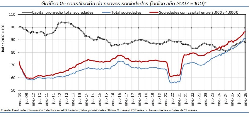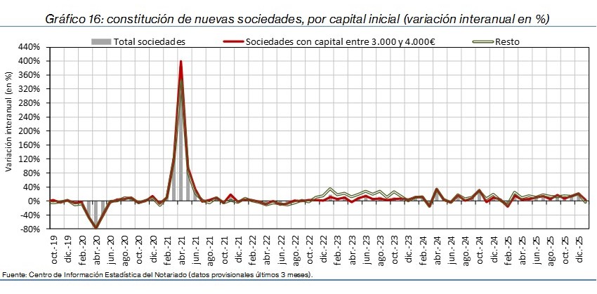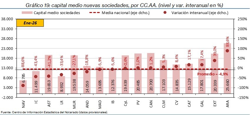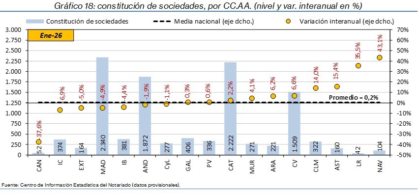 - La constitución de nuevas sociedades se incrementó un 0,2% interanual en España. Destacaron los aumentos en Navarra (43,1%), La Rioja (35,5%) y Asturias (15,4%) y los retrocesos en Cantabria (-37,6%), Islas Canarias (-6,9%) y Extremadura (-5,0%).