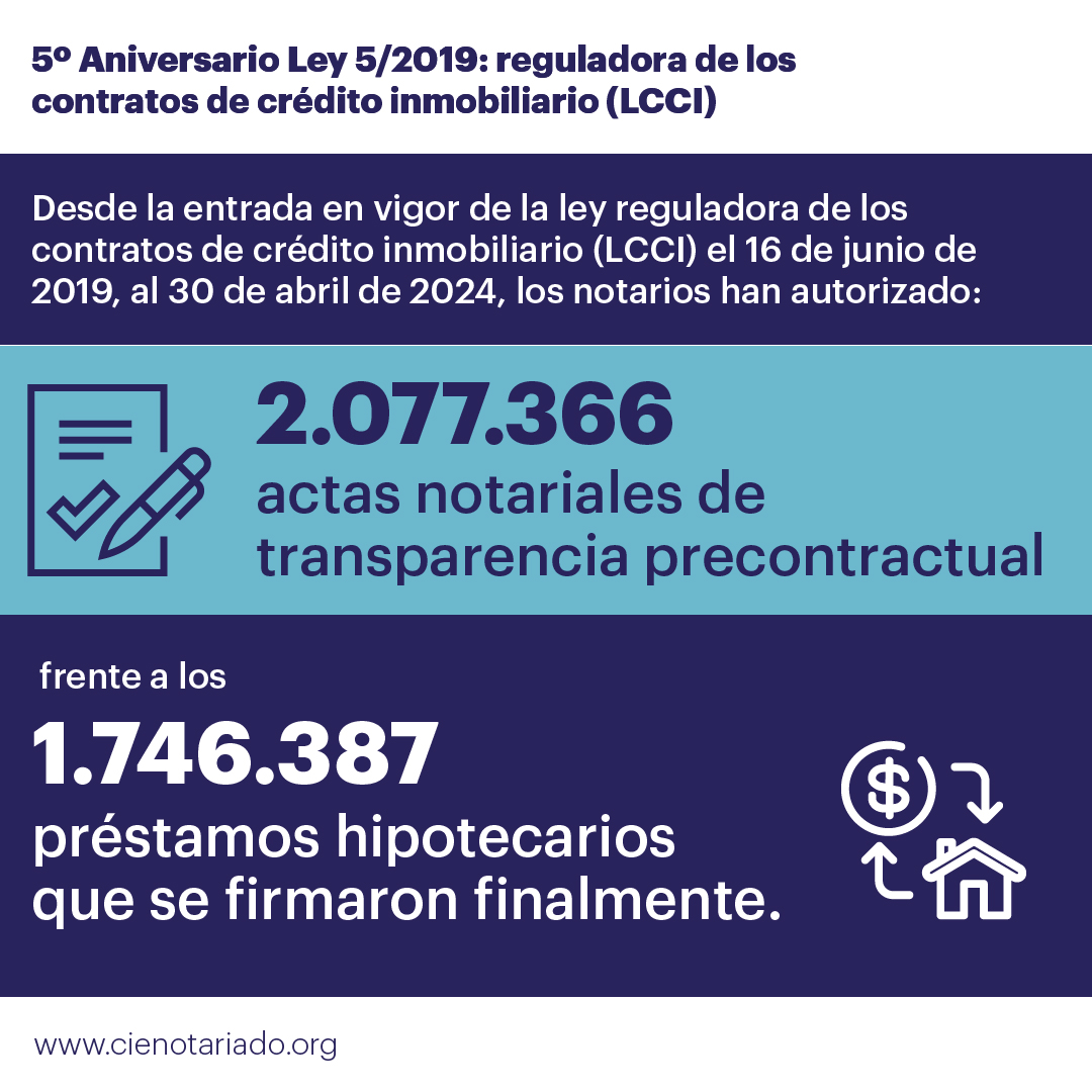 Del 16 de junio de 2019, fecha de entrada en vigor de la Ley reguladora de los contratos de crédito inmobiliario (LCCI), al 30 de abril de 2024, los notarios han autorizado 2.077.366 actas notariales de transparencia precontractual, frente a los 1.746.387 préstamos hipotecarios que se firmaron finalmente. En el primer trimestre de 2024 el 89,7% de los requirentes de actas notariales de transparencia previas a las hipotecas fueron nacionales, un 51,8% hombres y el 48,2% mujeres. Por rango de edad lideraron los consumidores de entre 35 y 44 años (el 33,4%) y en el 53,9% de los casos las hipotecas se solicitaron entre dos personas.