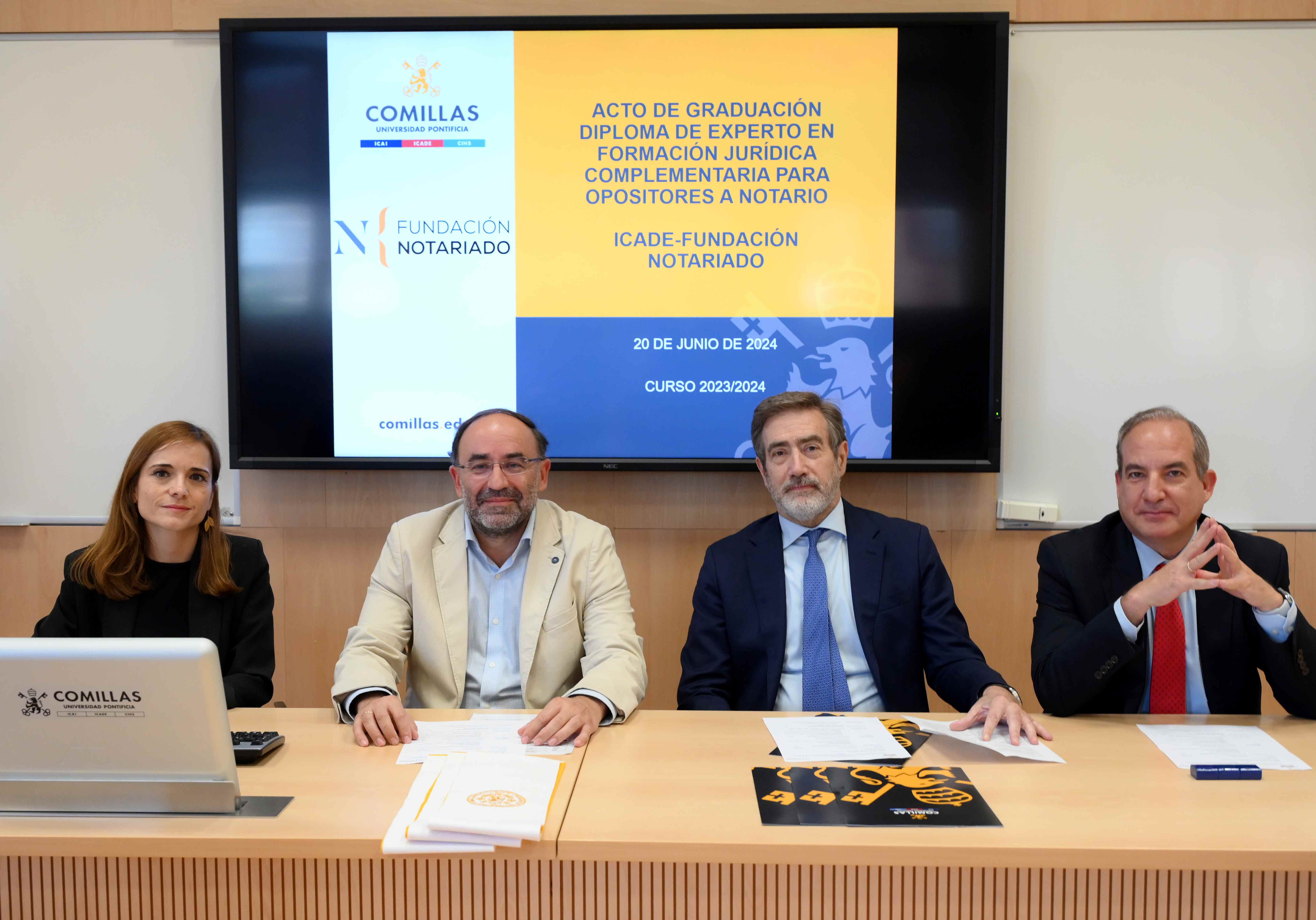 En el acto han participado Abel Veiga, decano de la Facultad de Derecho-ICADE; Ignacio Gomá, director general de Fundación Notariado; Antonio Alonso Timón, director del Centro de Innovación del Derecho (CID-ICADE), y Vanesa Morente, profesora de ICADE y directora del Diploma. Los estudiantes de esta segunda edición recibieron las bandas de la Universidad Pontificia Comillas de manos de Abel Veiga, quien comenzó su discurso valorando “la rigurosidad, generosidad e ilusión” del notariado por apoyar este proyecto pionero que se gestó en 2020 por la visión e impulso del presidente del Consejo General del Notariado y Fundación Notariado, José Ángel Martínez Sanchiz. El Decano afirmó también que la meta de cualquier centro universitario debe ser su utilidad, y creer en sus alumnos y que “el fondo jurídico de estos alumnos es envidiable”. Por su parte, Ignacio Gomá también incidió en la alta cualificación de los recién graduados: “Todos hemos sido opositores. Tenemos la misma formación, independientemente del resultado que hayamos obtenido porque dependía de muchos factores. Estoy seguro de que con vuestros conocimientos y este programa vais a marcar la diferencia”.