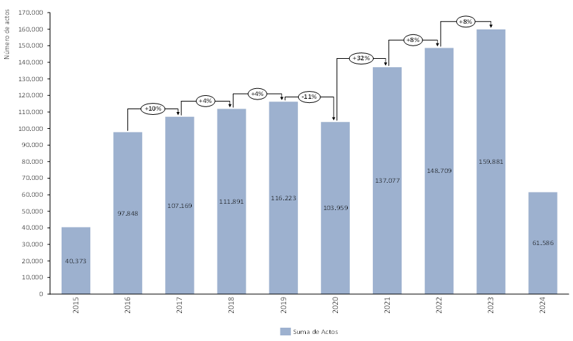 Cabe señalar que, en el año 2023, de los 104.474 actos de sucesiones celebrados, 100.540 correspondieron a actas de notoriedad de herederos abintestato, lo que significa un incremento del (2%) respecto al año 2022 (con 98.941 actos).