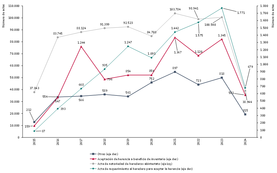 Dentro del grupo de sucesiones también se encuentran las actas de requerimiento al heredero para aceptar la herencia y la aceptación de herencia a beneficio de inventario, ambas con un volumen de actos realizados de 9.888 y 8.867, respectivamente.