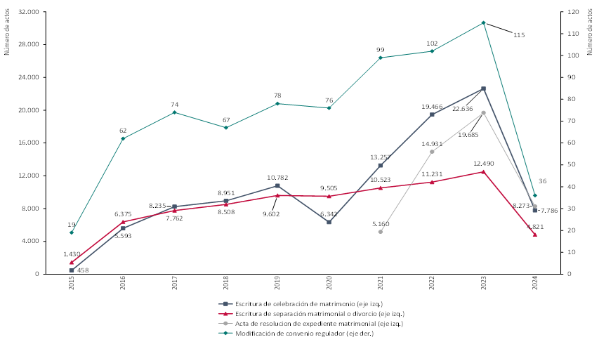 Dentro de este grupo de actos se han realizado un total de 234.530, de los cuales 103.506 correspondieron a la celebración de matrimonios (un 44%); 82.247 a divorcios o separaciones (un 35%); 48.049 a expedientes matrimoniales previos (alcanzando el 21%); y 728 a modificaciones de convenios reguladores (menos del 1%). En 2023, la mayor parte de los 54.926 actos celebrados relacionados con familia, 22.636 (un 41%), fueron matrimonios, con un aumento del 14% con respecto a 2022.