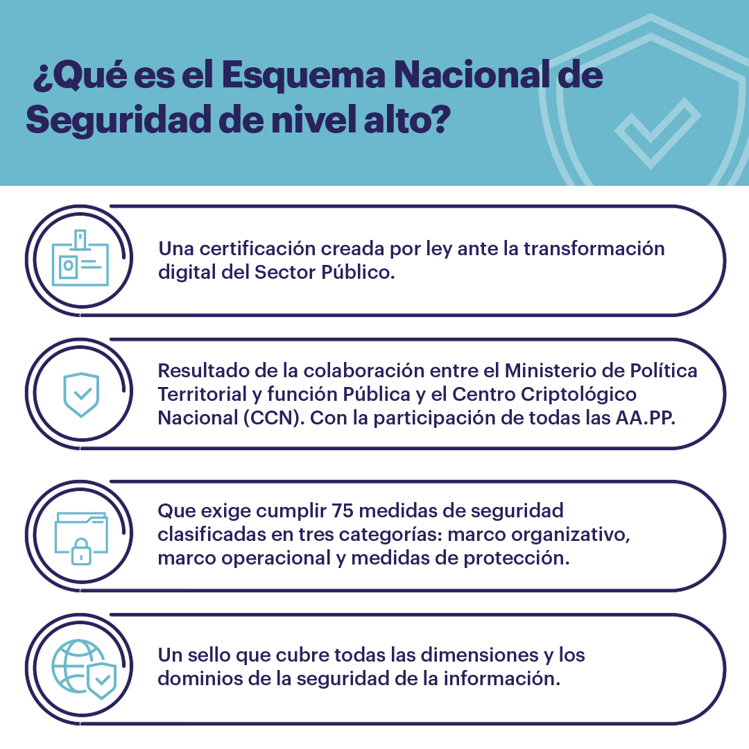 Este sello ofrece garantías de que la seguridad se aplica en sus tres ejes fundamentales: aplicaciones y servicios ofrecidos a los ciudadanos; custodia y tratamiento de los datos; y el ciclo de vida de los servicios, desde su concepción inicial hasta su puesta en marcha y explotación. Esta certificación exige para el nivel alto cumplir 75 medidas de seguridad, clasificadas en tres categorías: marco organizativo, marco operacional y medidas de protección.