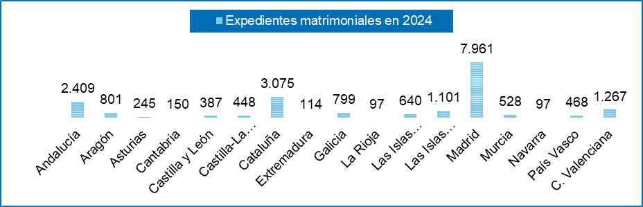 En enero y febrero de 2025, a nivel nacional se autorizaron 2.970 expedientes de este tipo, frente a las 3.097 del mismo periodo de 2024, siendo Madrid, Cataluña y Andalucía las comunidades en las que más se realizó el expediente matrimonial ante notario. Al igual que en 2024, en el que se autorizaron 7.961 en la Comunidad de Madrid, seguida de Cataluña (con 3.075), Andalucía (con 2.409) y la Comunidad Valenciana (con 1.267), concentrando entre las cuatro casi el 70% del total nacional.