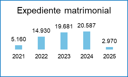 Desde el 30 de abril de 2021; con la entrada en vigor de la reforma del Código Civil y de la Ley de Registro Civil que permitió la tramitación ante notario del expediente matrimonial; se han autorizado 63.328 actos de este tipo (hasta febrero de 2025). Entre mayo y diciembre del primer año se realizaron 5.160 expedientes matrimoniales; en 2022 la cifra ascendió a 14.930 y alcanzó los 20.587 en 2024, lo que refleja un crecimiento sostenido de la solicitud por esta vía por su agilidad, y por la seguridad jurídica y tecnológica que aporta su realización ante notario.