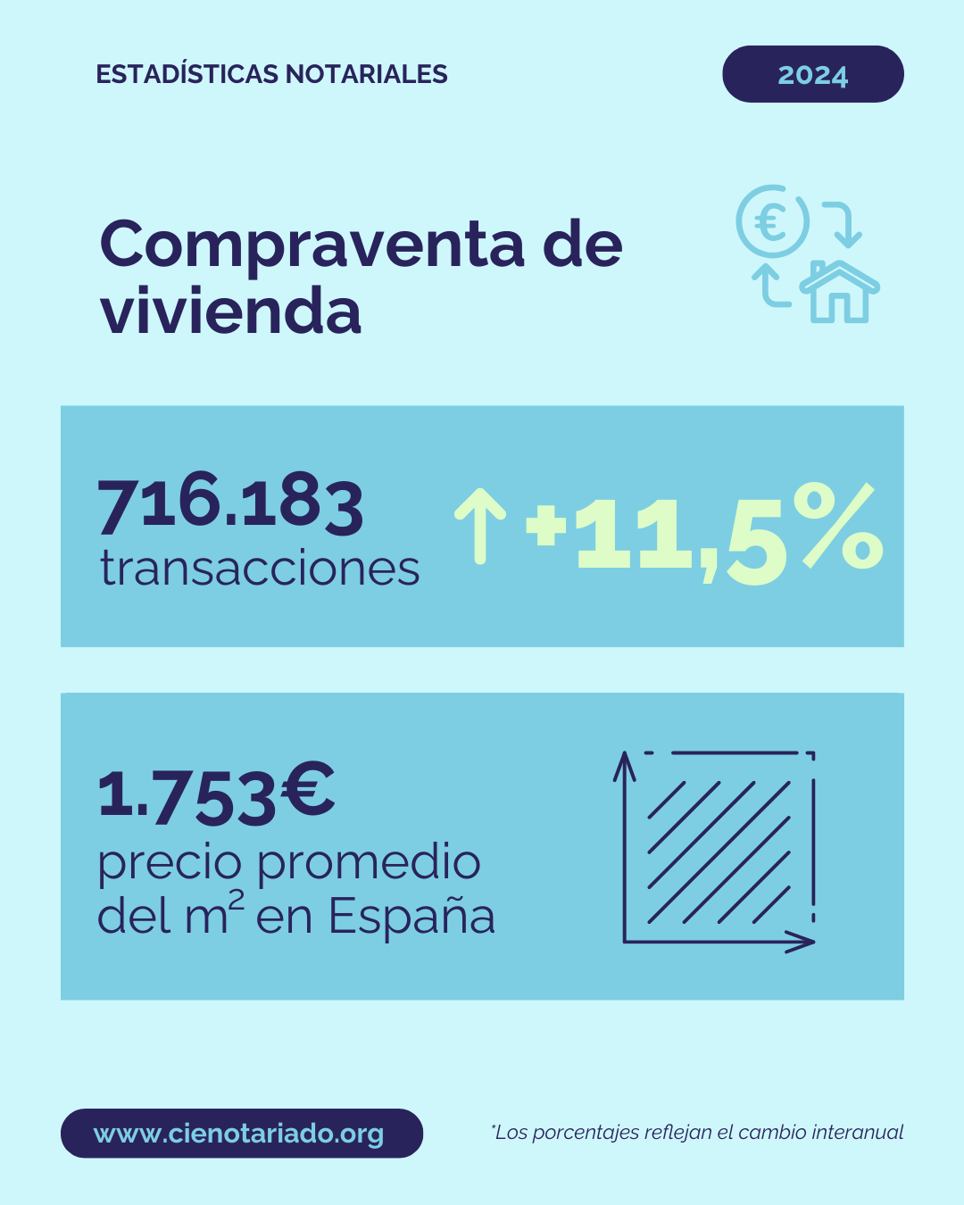 • 2024 mostró un marcado ascenso en el número de compraventas, con subidas en todos los trimestres. • En 2024, el número de compraventas de viviendas frente al año 2023, creció en la mayoría de comunidades y solo retrocedió en Navarra (-0,3%), destacando los ascensos de La Rioja (24,6%) y Asturias (20,3%). • En 2024, con respecto al 2023, el precio del m² subió un 6,9%, destacando Baleares (15,2%) y Cantabria (11,0%). Solo se observó descenso en Navarra (-0,9%). • En 2024, los nuevos préstamos para adquisición de vivienda aumentaron un 21,4% anual, hasta las 341.481 operaciones, subiendo en todas las autonomías. Su cuantía promedio fue de 155.592€: un 4,6% más frente al año 2023. • En 2024, la constitución de nuevas sociedades subió un 7,7%, destacando los incrementos en Cantabria (15,2%), Castilla La Mancha (12,4%) y Asturias (12,2%). • En diciembre, la compraventa de viviendas creció un 18,5% interanual, con precios promedio que aumentaron un 7,7%. La concesión de nuevos préstamos hipotecarios para la adquisición de vivienda aumentó un 33,6%.