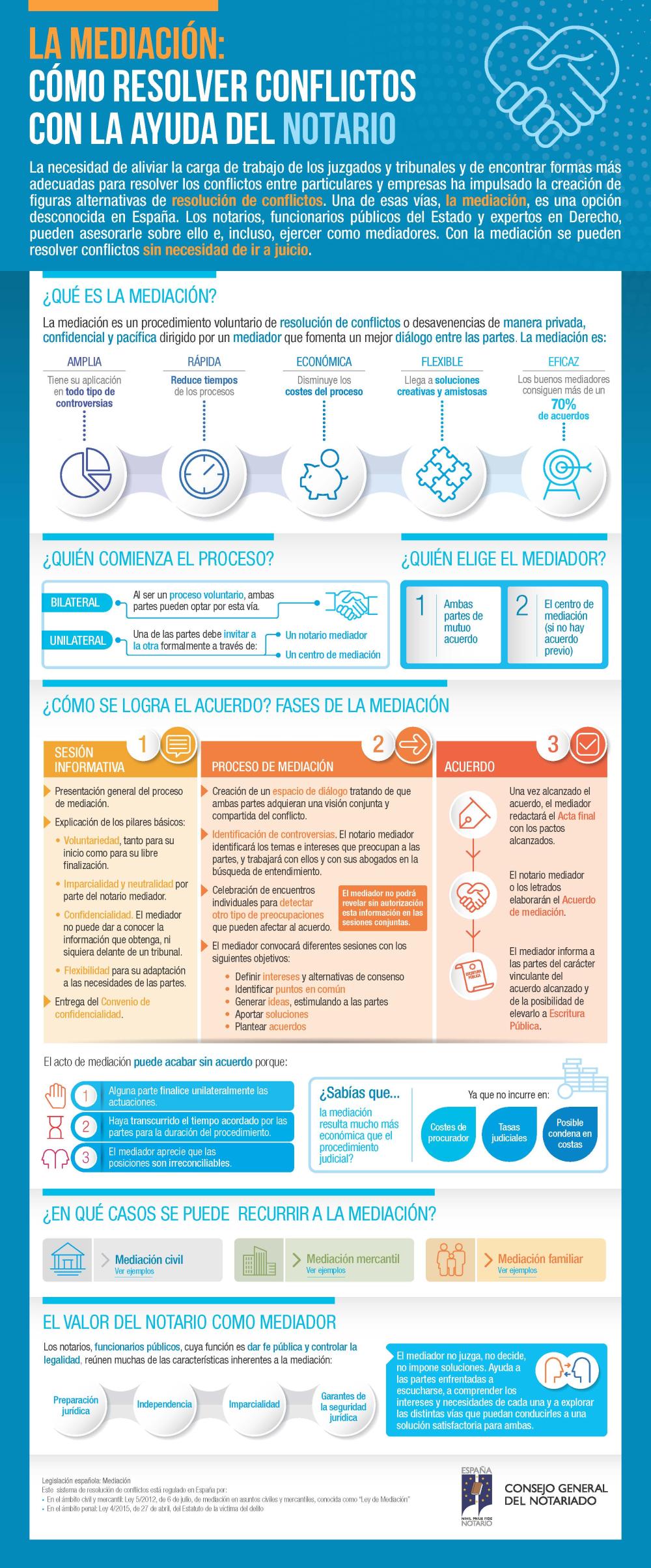 The essential part of this model is the mediator, who must find a negotiated solution accepted by the parties. Notaries, public officials to whom the State vests the power of issuing public attestation and controlling legality, possess many of the characteristics inherent to mediation: legal preparation, independence, impartiality or guarantors of legal certainty. The notary adds to all this appropriate training and skill in the use of the necessary mediation techniques.